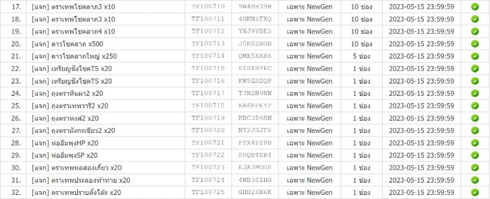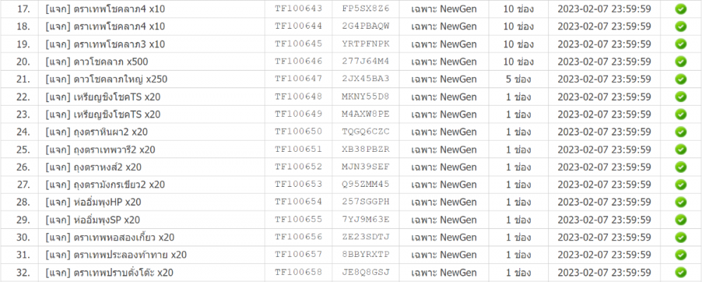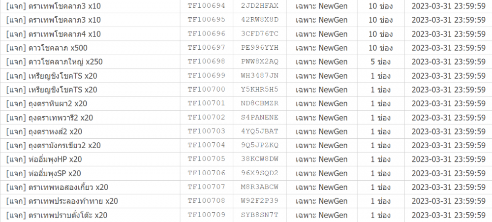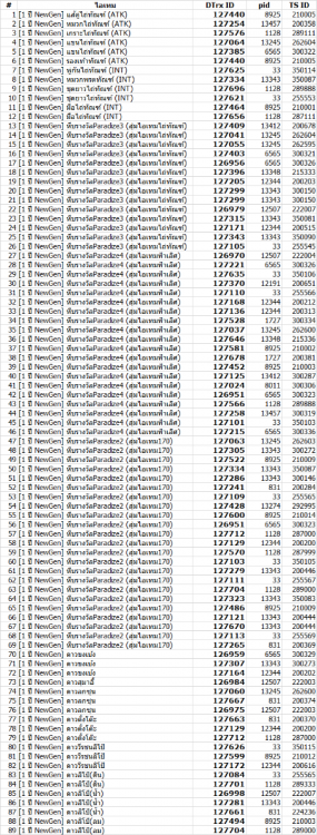 # ไอเทม DTrx ID pid TS ID 1 [1 ปี NewGen] แส้คู่ไถ่ทัณฑ์ (ATK) 127440 8925 210005 2 [1 ปี NewGen] หมวกไถ่ทัณฑ์ (ATK) 127254 13457 200358 3 [1 ปี NewGen] เกราะไถ่ทัณฑ์ (ATK) 127576 1128 289111 4 [1 ปี NewGen] แขนไถ่ทัณฑ์ (ATK) 127064 13245 262604 5 [1 ปี NewGen] แขนไถ่ทัณฑ์ (ATK) 127385 6565 300322 6 [1 ปี NewGen] รองเท้าทัณฑ์ (ATK) 127440 8925 210005 7 [1 ปี NewGen] พู่กันไถ่ทัณฑ์ (INT) 127625 33 350114 8 [1 ปี NewGen] หมวกพรตทัณฑ์ (INT) 127334 13343 350087 9 [1 ปี NewGen] ชุดยาวไถ่ทัณฑ์ (INT) 127696 1128 289888 10 [1 ปี NewGen] ชุดยาวไถ่ทัณฑ์ (INT) 127621 33 255553 11 [1 ปี NewGen] มือไถ่ทัณฑ์ (INT) 127464 8925 210001 12 [1 ปี NewGen] มือไถ่ทัณฑ์ (INT) 127656 1128 287111 13 [1 ปี NewGen] หีบรางวัลParadize3 (สุ่มไอเทมไถ่ทัณฑ์) 127409 13412 200678 14 [1 ปี NewGen] หีบรางวัลParadize3 (สุ่มไอเทมไถ่ทัณฑ์) 127041 13245 262604 15 [1 ปี NewGen] หีบรางวัลParadize3 (สุ่มไอเทมไถ่ทัณฑ์) 127055 13245 262595 16 [1 ปี NewGen] หีบรางวัลParadize3 (สุ่มไอเทมไถ่ทัณฑ์) 127403 6565 300321 17 [1 ปี NewGen] หีบรางวัลParadize3 (สุ่มไอเทมไถ่ทัณฑ์) 126956 6565 300326 18 [1 ปี NewGen] หีบรางวัลParadize3 (สุ่มไอเทมไถ่ทัณฑ์) 127396 13348 215333 19 [1 ปี NewGen] หีบรางวัลParadize3 (สุ่มไอเทมไถ่ทัณฑ์) 127205 12344 200203 20 [1 ปี NewGen] หีบรางวัลParadize3 (สุ่มไอเทมไถ่ทัณฑ์) 127299 13343 300150 21 [1 ปี NewGen] หีบรางวัลParadize3 (สุ่มไอเทมไถ่ทัณฑ์) 127299 13343 300150 22 [1 ปี NewGen] หีบรางวัลParadize3 (สุ่มไอเทมไถ่ทัณฑ์) 126979 12507 222007 23 [1 ปี NewGen] หีบรางวัลParadize3 (สุ่มไอเทมไถ่ทัณฑ์) 127315 13343 350081 24 [1 ปี NewGen] หีบรางวัลParadize3 (สุ่มไอเทมไถ่ทัณฑ์) 127171 12344 200515 25 [1 ปี NewGen] หีบรางวัลParadize3 (สุ่มไอเทมไถ่ทัณฑ์) 127343 13343 350090 26 [1 ปี NewGen] หีบรางวัลParadize3 (สุ่มไอเทมไถ่ทัณฑ์) 127105 33 255545 27 [1 ปี NewGen] หีบรางวัลParadize4 (สุ่มไอเทมฟ้าเลิศ) 126970 12507 222004 28 [1 ปี NewGen] หีบรางวัลParadize4 (สุ่มไอเทมฟ้าเลิศ) 127221 6565 300326 29 [1 ปี NewGen] หีบรางวัลParadize4 (สุ่มไอเทมฟ้าเลิศ) 127635 33 350106 30 [1 ปี NewGen] หีบรางวัลParadize4 (สุ่มไอเทมฟ้าเลิศ) 127370 12191 200651 31 [1 ปี NewGen] หีบรางวัลParadize4 (สุ่มไอเทมฟ้าเลิศ) 127110 33 255566 32 [1 ปี NewGen] หีบรางวัลParadize4 (สุ่มไอเทมฟ้าเลิศ) 127168 12344 200212 33 [1 ปี NewGen] หีบรางวัลParadize4 (สุ่มไอเทมฟ้าเลิศ) 127136 12344 200313 34 [1 ปี NewGen] หีบรางวัลParadize4 (สุ่มไอเทมฟ้าเลิศ) 127528 1727 300334 35 [1 ปี NewGen] หีบรางวัลParadize4 (สุ่มไอเทมฟ้าเลิศ) 127037 13245 262600 36 [1 ปี NewGen] หีบรางวัลParadize4 (สุ่มไอเทมฟ้าเลิศ) 127646 13348 215336 37 [1 ปี NewGen] หีบรางวัลParadize4 (สุ่มไอเทมฟ้าเลิศ) 127581 8925 210002 38 [1 ปี NewGen] หีบรางวัลParadize4 (สุ่มไอเทมฟ้าเลิศ) 127678 1727 200381 39 [1 ปี NewGen] หีบรางวัลParadize4 (สุ่มไอเทมฟ้าเลิศ) 127452 8925 210003 40 [1 ปี NewGen] หีบรางวัลParadize4 (สุ่มไอเทมฟ้าเลิศ) 127125 13412 300287 41 [1 ปี NewGen] หีบรางวัลParadize4 (สุ่มไอเทมฟ้าเลิศ) 127024 8011 300306 42 [1 ปี NewGen] หีบรางวัลParadize4 (สุ่มไอเทมฟ้าเลิศ) 126951 6565 300323 43 [1 ปี NewGen] หีบรางวัลParadize4 (สุ่มไอเทมฟ้าเลิศ) 127566 1128 289888 44 [1 ปี NewGen] หีบรางวัลParadize4 (สุ่มไอเทมฟ้าเลิศ) 127258 13457 300319 45 [1 ปี NewGen] หีบรางวัลParadize4 (สุ่มไอเทมฟ้าเลิศ) 127101 33 350103 46 [1 ปี NewGen] หีบรางวัลParadize4 (สุ่มไอเทมฟ้าเลิศ) 127215 6565 300336 47 [1 ปี NewGen] หีบรางวัลParadize2 (สุ่มไอเทม170) 127063 13245 262603 48 [1 ปี NewGen] หีบรางวัลParadize2 (สุ่มไอเทม170) 127305 13343 300272 49 [1 ปี NewGen] หีบรางวัลParadize2 (สุ่มไอเทม170) 127522 8925 210009 50 [1 ปี NewGen] หีบรางวัลParadize2 (สุ่มไอเทม170) 127334 13343 350087 51 [1 ปี NewGen] หีบรางวัลParadize2 (สุ่มไอเทม170) 127286 13343 300146 52 [